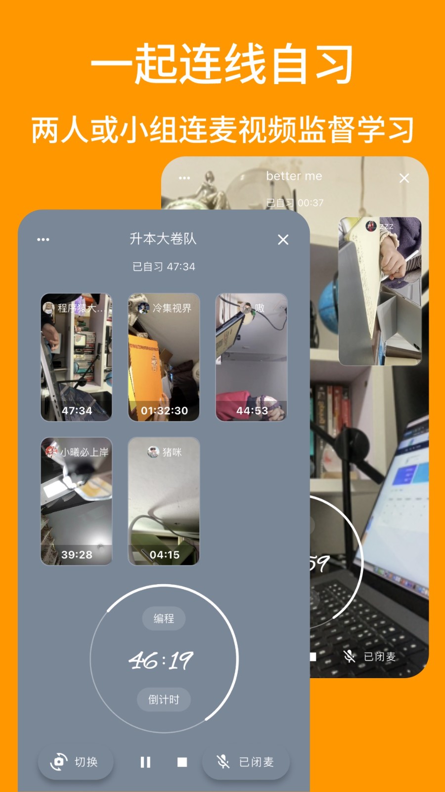 2、连线自习:支持两人或者小组连麦视频一起在线学习互相监督;