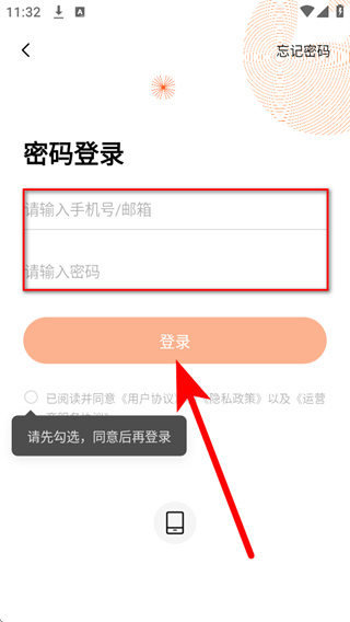 4、在密码登录页面填写账号密码,勾选相关协议后,点击登录完成账号登录。