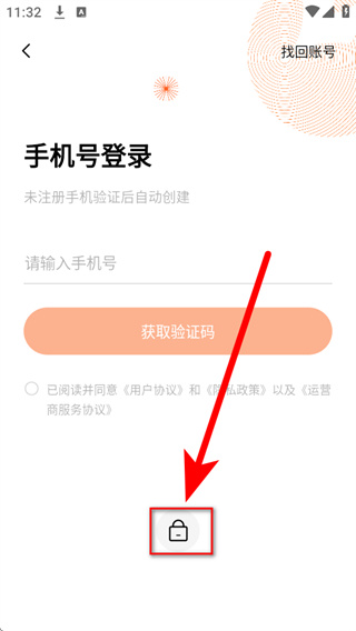 3、在手机号登录界面点击密码图标,切换到密码登录的模式。