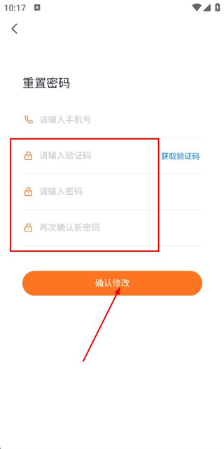 3、在重置密码页面填写验证码、新密码及确认密码后,点击确认修改按钮完成密码重置。