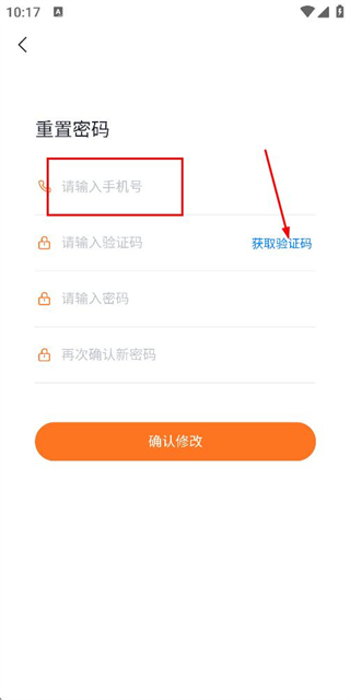 2、在重置密码页面输入手机号后,点击获取验证码按钮获取验证码。