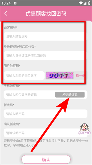 3、在找回密码页面,输入顾客编号等信息,点击发送验证码。