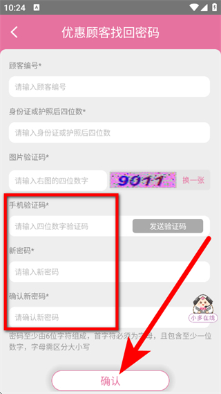 4、输入手机验证码,设置新密码,点击确认,完成密码找回。
