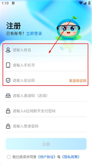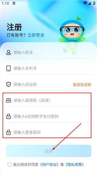 4、在注册页面,填写选填的邀请码、支付密码、登录密码,点击注册。