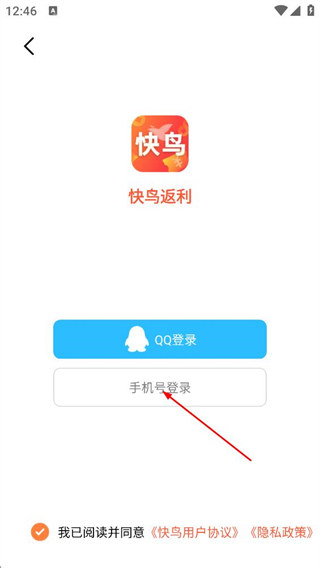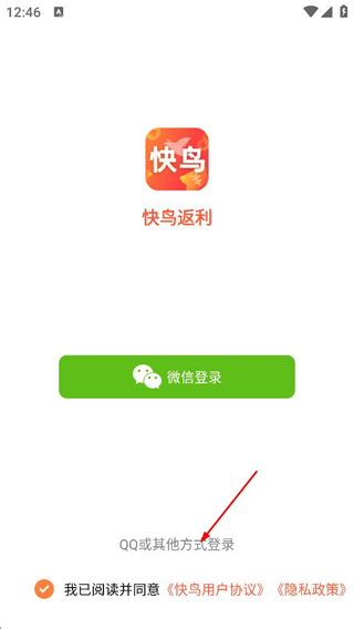 1、在快鸟返利登录页,点击QQ或其他方式登录的选项。