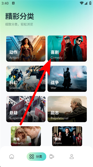 2、在精彩分类页面,点击选择喜剧分类,进入喜剧片的影视作品列表页面。