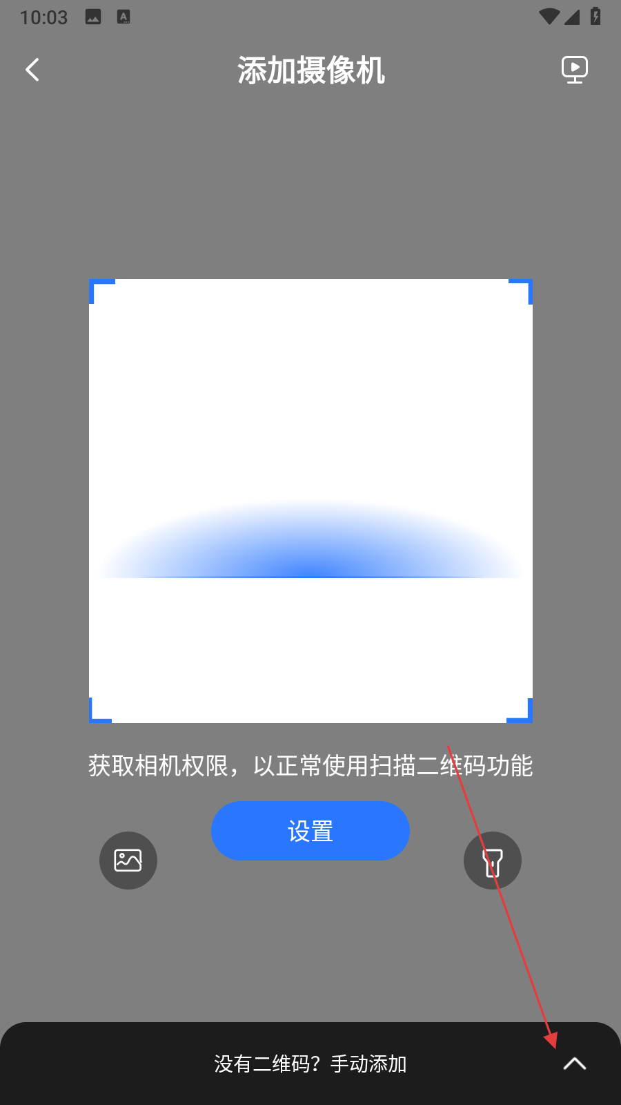 2、在添加摄像机界面,点击底部没有二维码?手动添加旁的展开箭头,弹出设备类型选项。