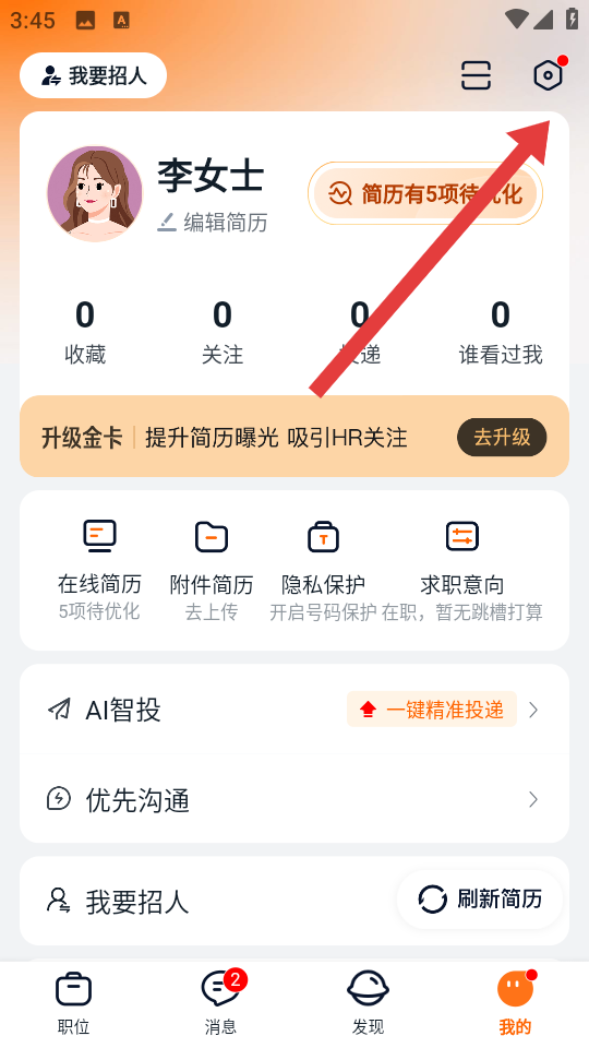 1、打开猎聘APP,进入我的页面,点击右上角齿轮状设置图标,进入设置的界面。