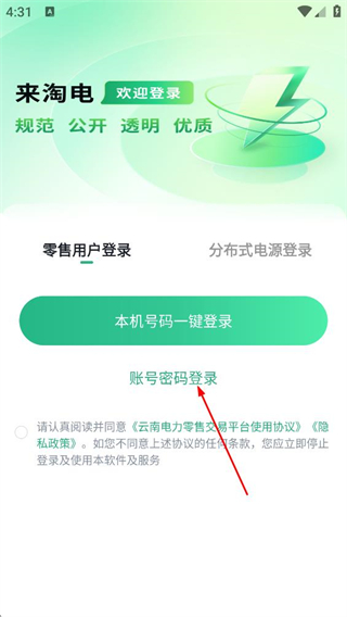 2、在登录页面,点击账号密码登录选项,进入账号密码登录界面。