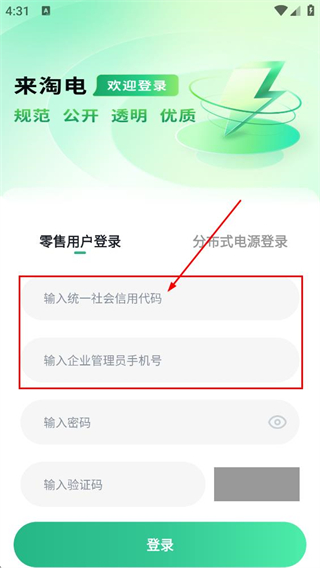 3、在账号密码登录界面,填写统一社会信用代码和企业管理员手机号。