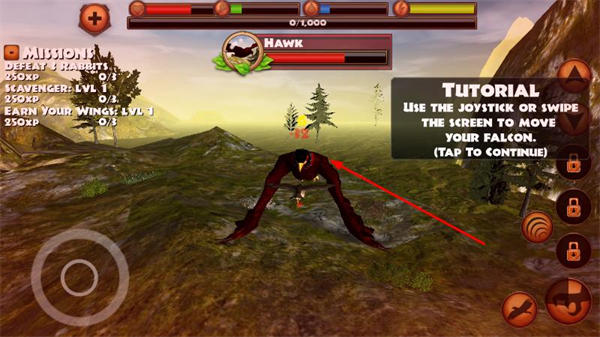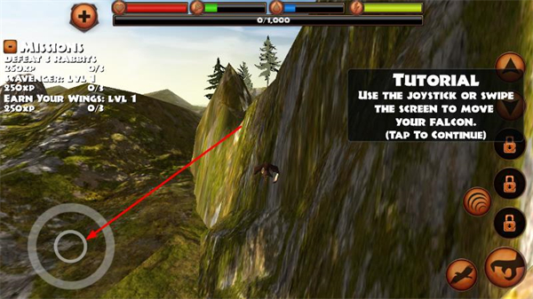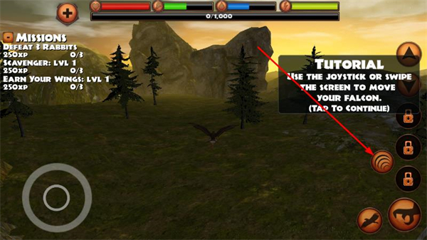1、在游戏界面通过左侧虚拟摇杆,控制猎鹰的移动方向,推进游戏进程。