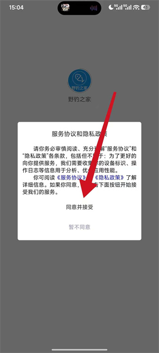 1、打开野钓之家,在弹窗中点击同意并接受,进入主界面。