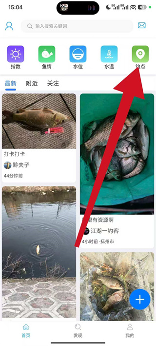 2、在主界面找到钓点功能入口,点击进入钓点地图页面。