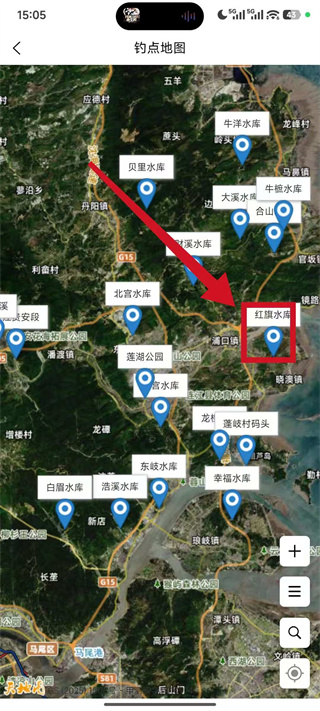 3、在钓点地图页面中,选择目标钓点,点击该钓点的标识进入详情页面。