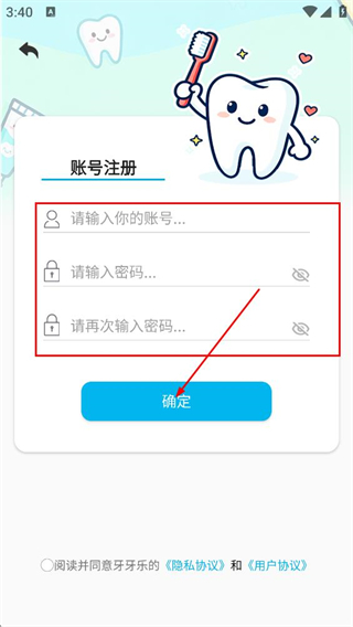 3、在账号注册页面,填写账号、密码、确认密码,点击确定完成注册。