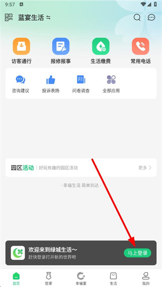1、打开绿城生活app,在首页找到马上登录按钮并点击。