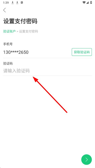 4、在设置支付密码页面,点击获取验证码,输入收到的验证码,即可继续完成支付密码设置。