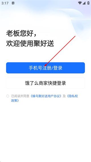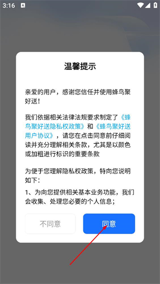 1、阅读蜂鸟聚好送隐私权政策和蜂鸟聚好送用户协议后,点击同意。
