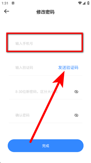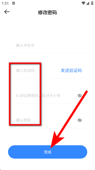 3、输入验证码,设置新密码,点击完成,完成密码重置。