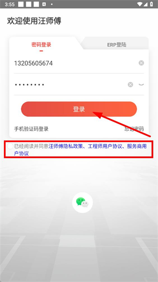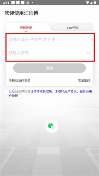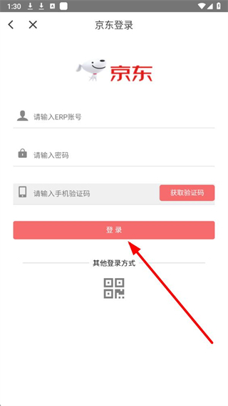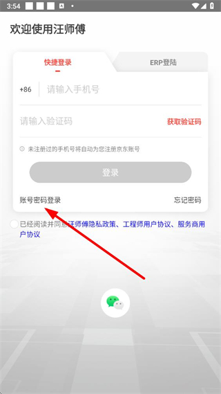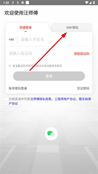 1、打开汪师傅app,找到ERP登陆选项并点击,切换至京东登录相关页面。