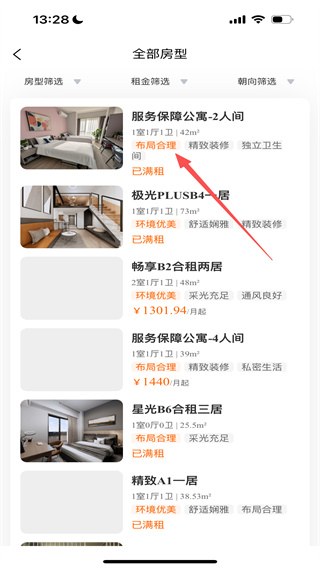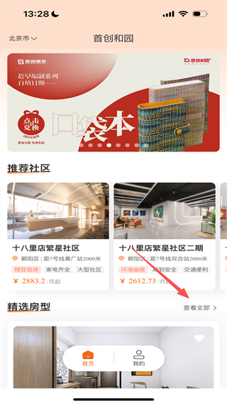 1、进入首页后,点击精选房型旁的查看全部选项,可进入全部房型页面。
