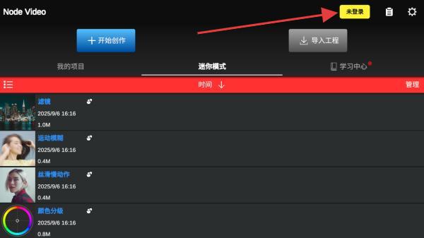 1、打开NodeVideoAPP,点击界面右上角的未登录的按钮。