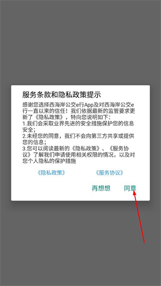 1、打开西海岸公交e行,阅读服务条款和隐私政策提示,确认后点击同意按钮。