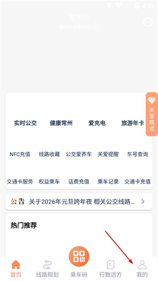 1、打开常州行,进入首页后,点击页面底部的我的选项进入个人页面。