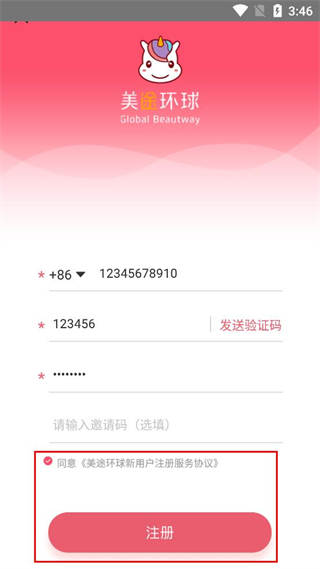 4、勾选同意美途环球新用户注册服务协议,点击页面中的注册按钮完成注册。