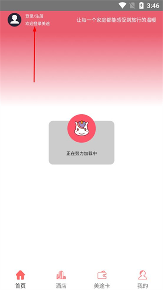 1、打开美途环球,进入首页后,点击页面顶部的登录/注册选项进入相关界面。