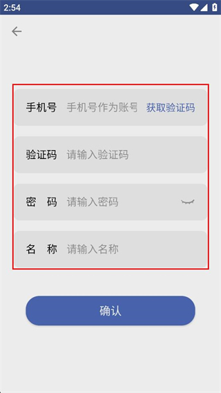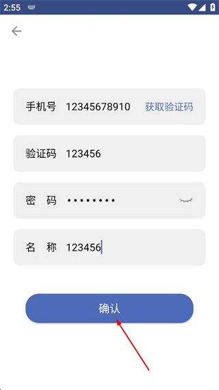 4、确认手机号验证码密码名称都填写完毕后,点击页面下方的确认按钮完成注册。