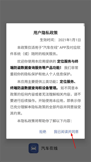 1、打开汽车在线,阅读用户隐私政策内容,确认后点击我已阅读并同意按钮。