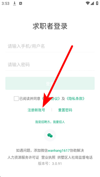 2、在求职者登录页面点击注册新账号选项,进入注册操作页面。