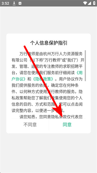 1、打开万行教师,在弹窗中点击同意,进入求职者登录页面。