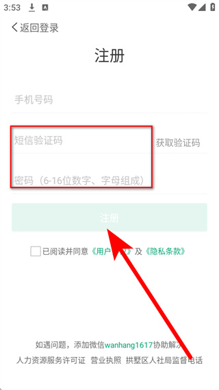 4、将收到的短信验证码填入短信验证码栏,设置密码,勾选协议后,点击注册完成账号注册。