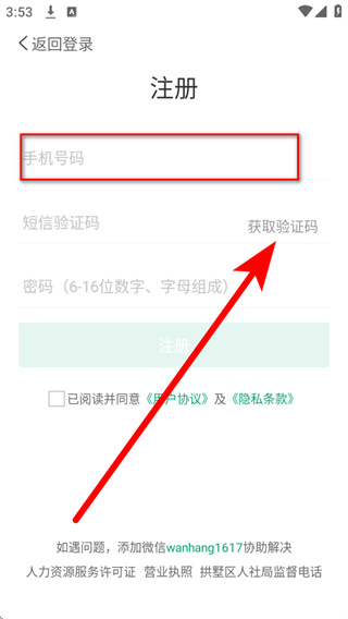 3、在注册页面的手机号码栏填写你的手机号,点击获取验证码。