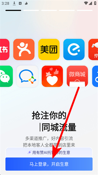 2、在主界面点击马上登录,开启生意,进入登录选择界面。