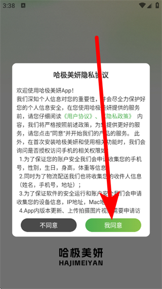 1、打开哈极美妍,在隐私协议弹窗,点击我同意,进入首页。