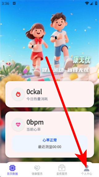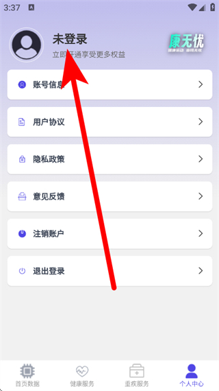 1、在康无忧首页,点击底部个人中心,进入个人中心页面。