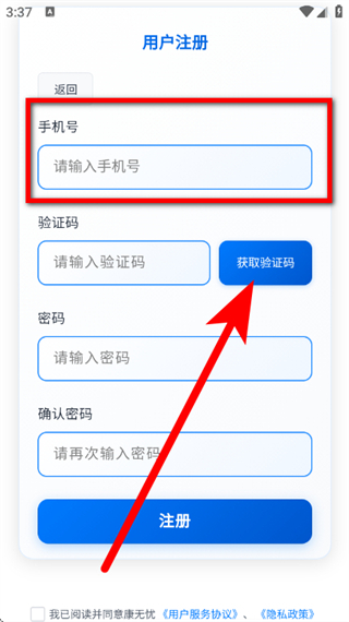 4、在用户注册页面,输入手机号,点击获取验证码。