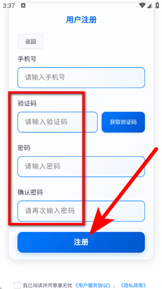 5、输入验证码,输入密码,勾选相关协议后,点击注册,完成账号注册。