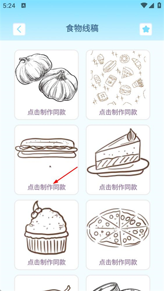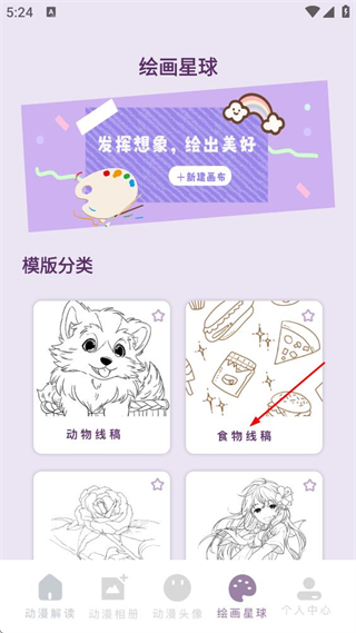 2、在绘画星球页面,点击食物线稿模板分类,进入食物线稿模板列表。