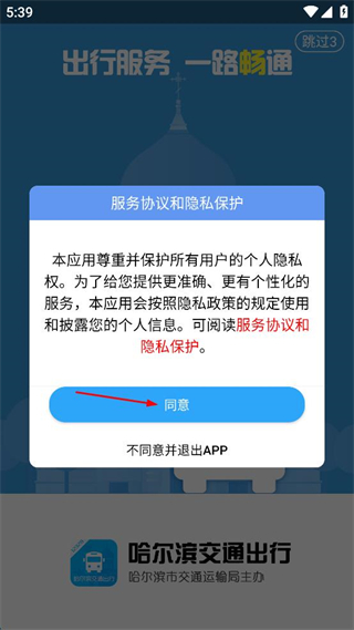 1、打开哈尔滨交通出行,阅读服务协议和隐私保护内容,确认后点击同意按钮。
