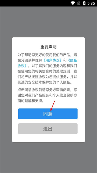 1、打开e洛通app,阅读重要声明中的用户协议和隐私协议内容,确认后点击同意按钮。