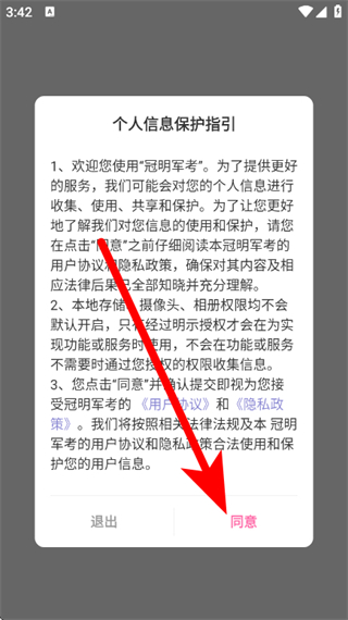 1、打开冠明军考,在弹窗中点击同意,进入登录页面。