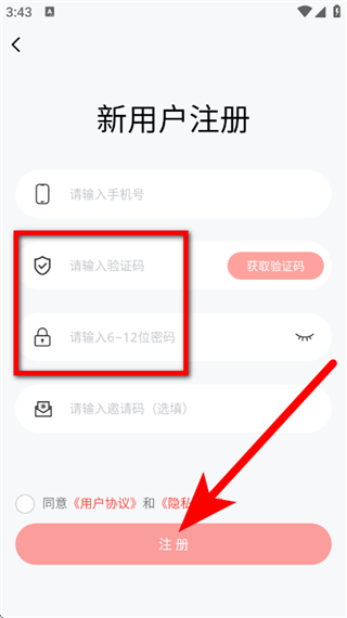 4、输入验证码,设置密码,勾选后,点击注册,完成新用户注册。