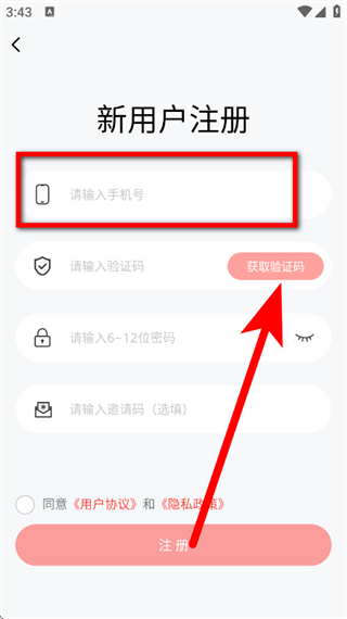 3、在新用户注册页面,输入手机号,点击获取验证码。