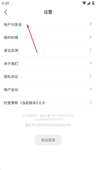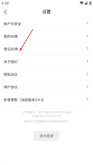 3、在设置页面,点击意见反馈选项,可进入意见反馈页面。