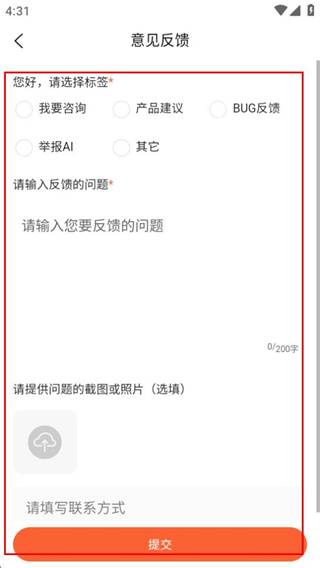4、在意见反馈页面,选择标签并填写反馈内容等信息。
