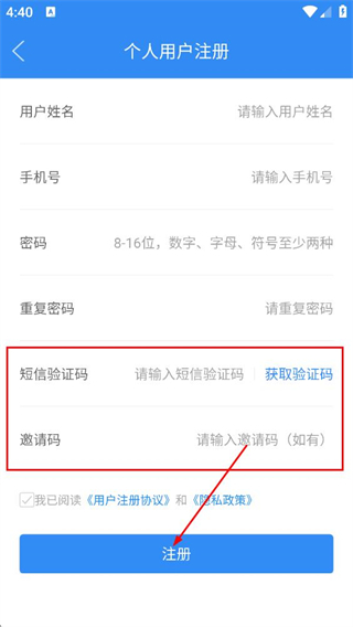 5、在页面,获取验证码后填写验证码,选填邀请码,点击注册可完成注册。